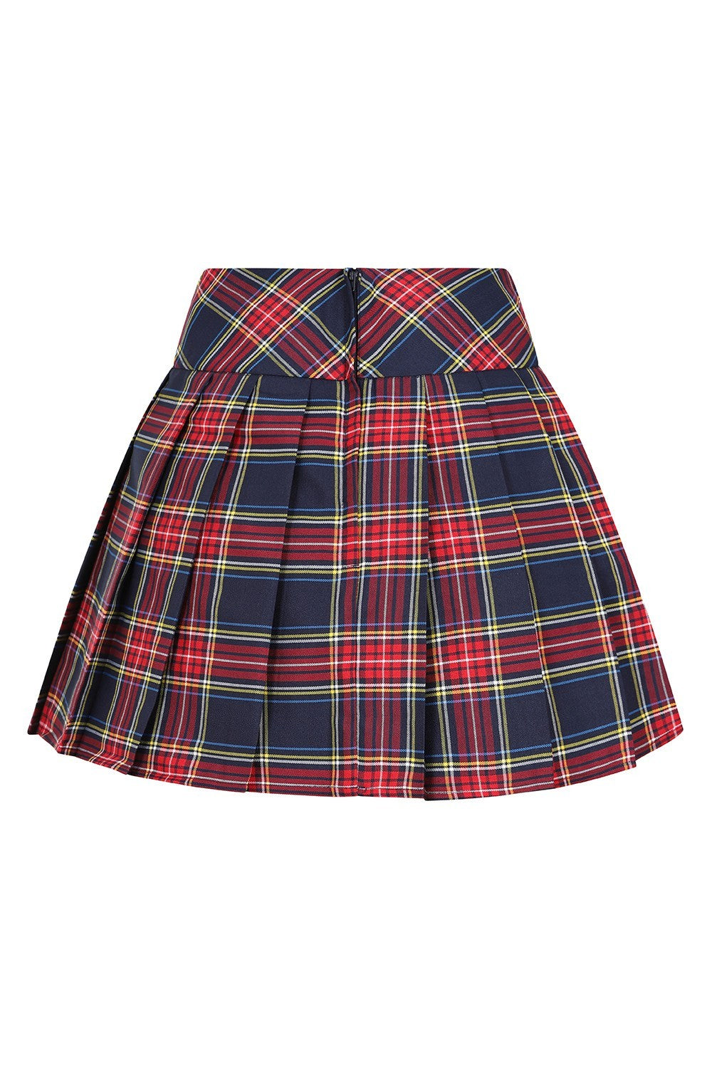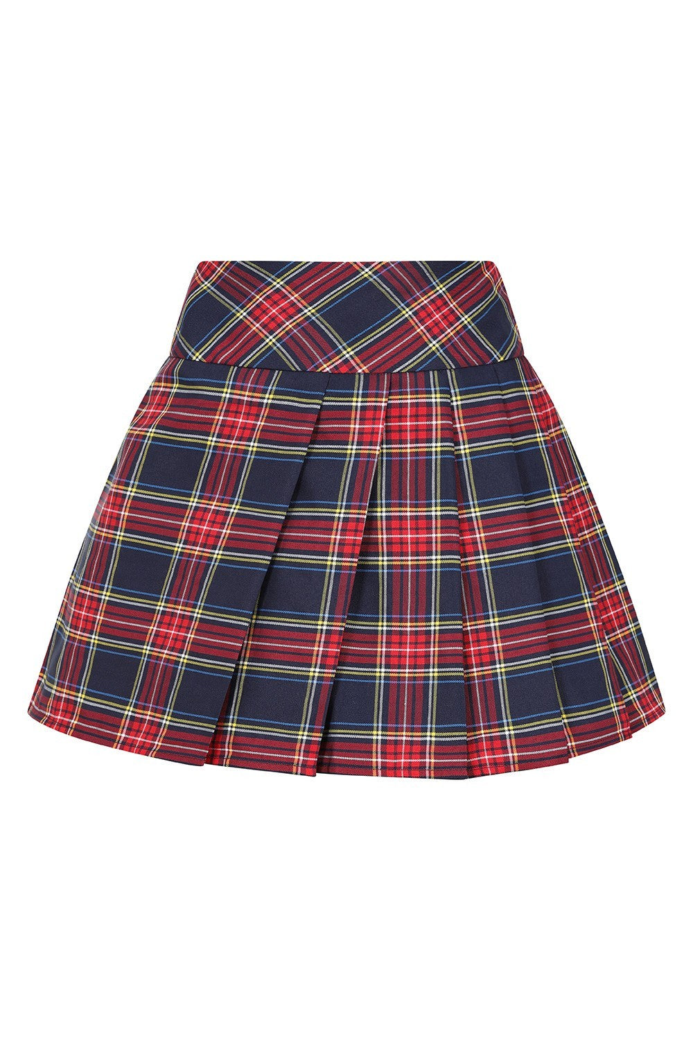 The Banned Apparel Navy Sisterhood Skirt is a classic pleated tartan mini designed for alt fashion lovers who want a bold, structured, punk-inspired staple piece in their wardrobe. This design uses a striking red, navy, yellow and white plaid pattern with a crisp pleated structure that keeps its shape and movement while worn. The waistband panel is cut in a contrasting diagonal tartan direction which adds definition, contour and a more refined finish.