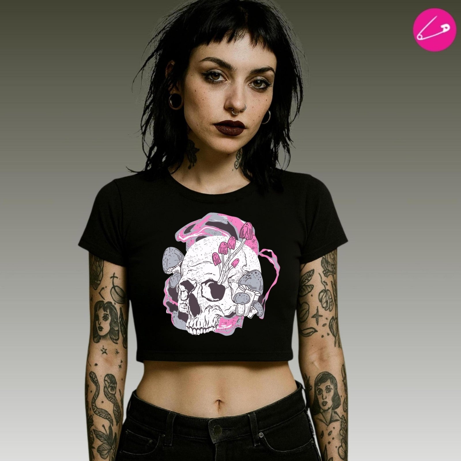 Skull Onyx Alternative Emo Gothic Grunge Rock Punk Black Short Sleeve Crop Top