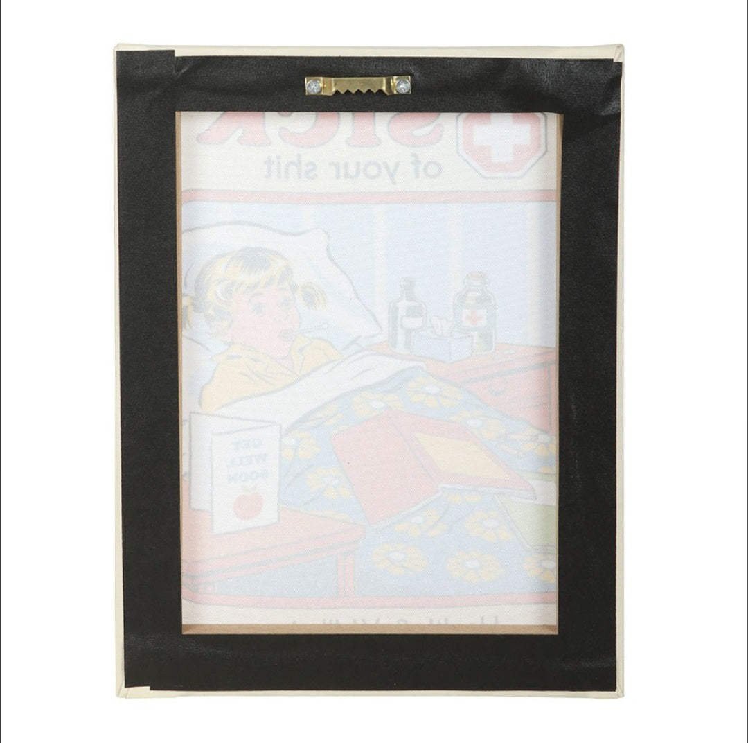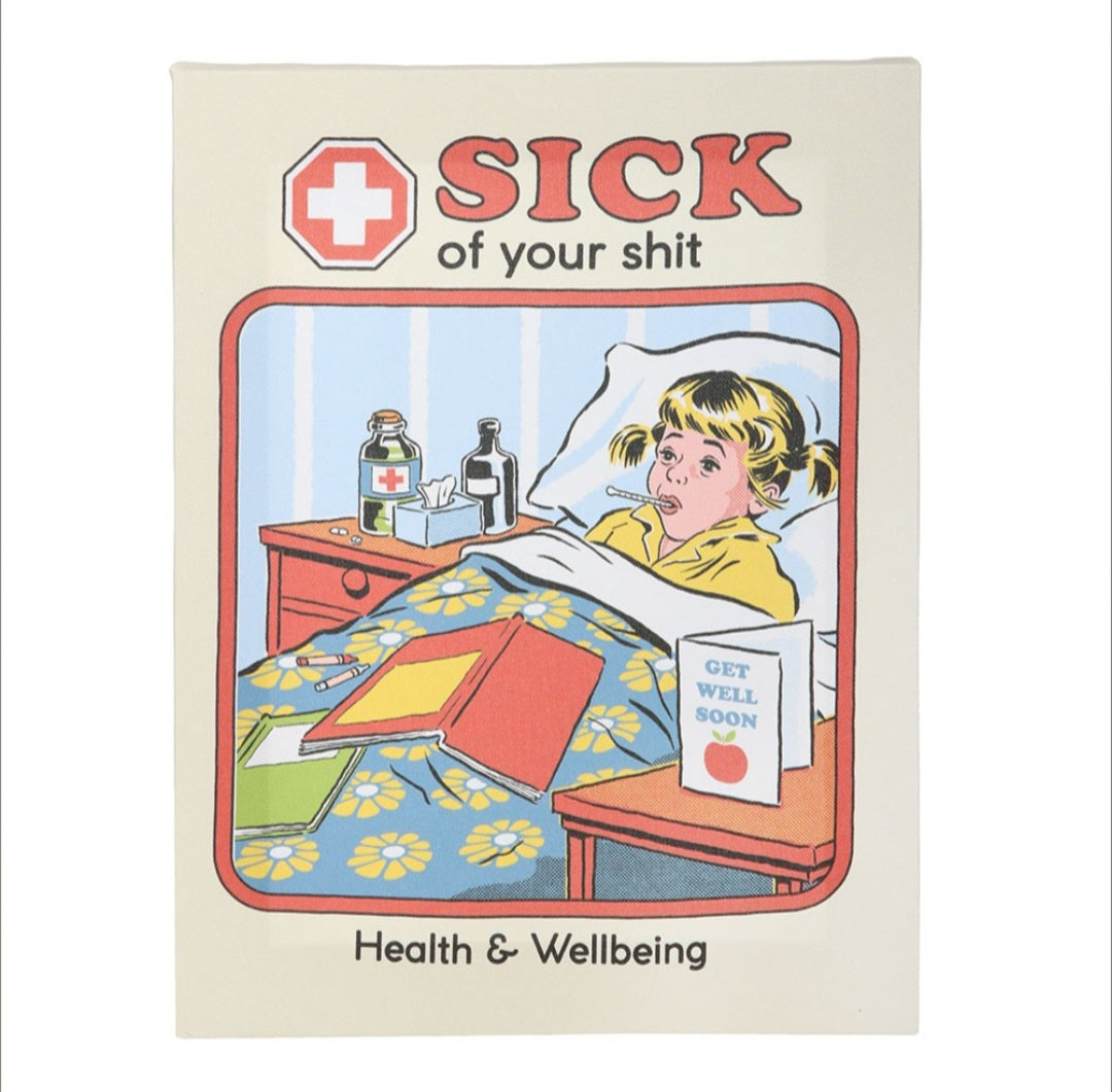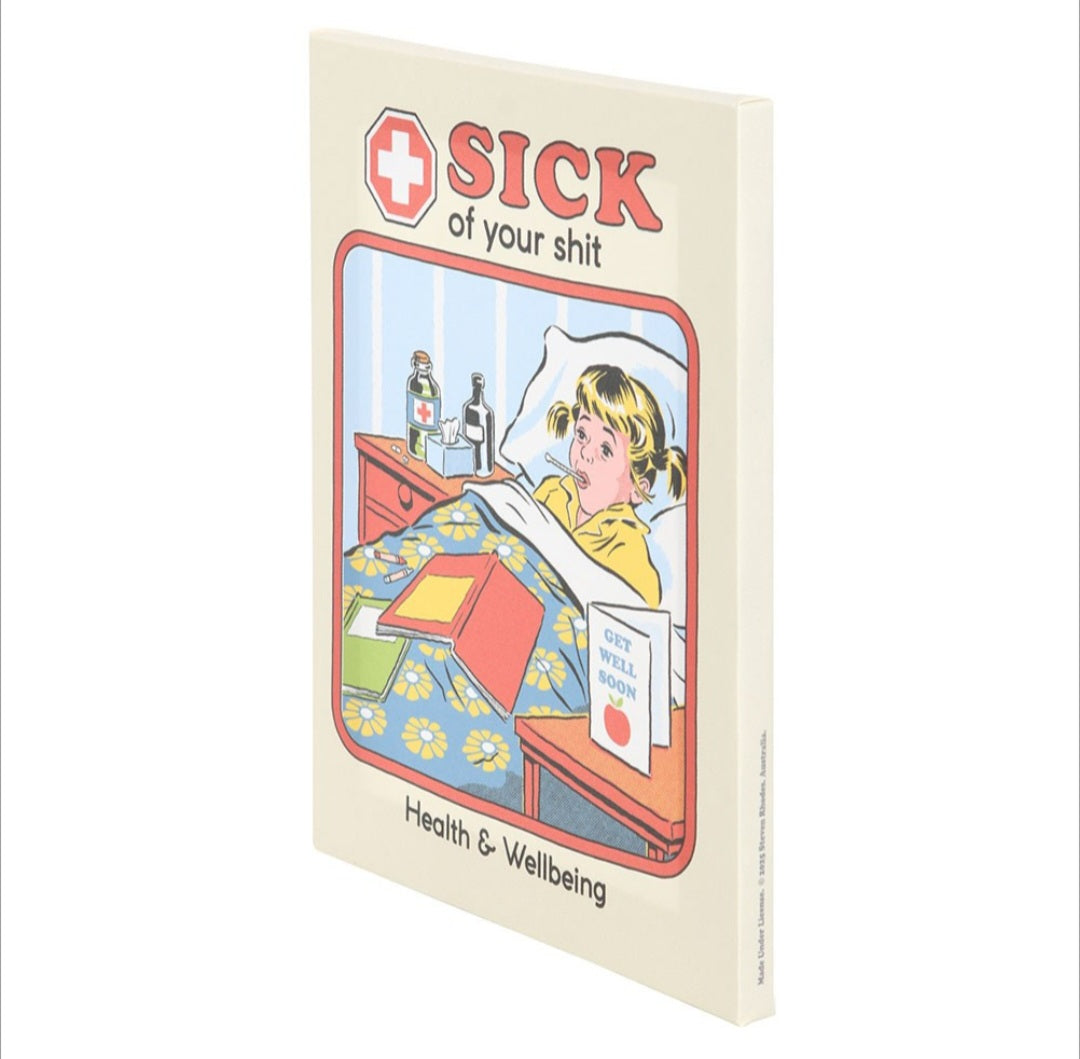 Inject some dark humour into your home with the Steven Rhodes “Sick Of Your Shit” Canvas Plaque, a brutally honest piece of retro wall art that blends 70s children’s book nostalgia with Rhodes’ trademark sarcastic twist. Measuring 19 x 25 cm, this canvas features a sick child in bed, surrounded by medicine, books and a “Get Well Soon” card — paired with the iconic caption: Sick of your shit.